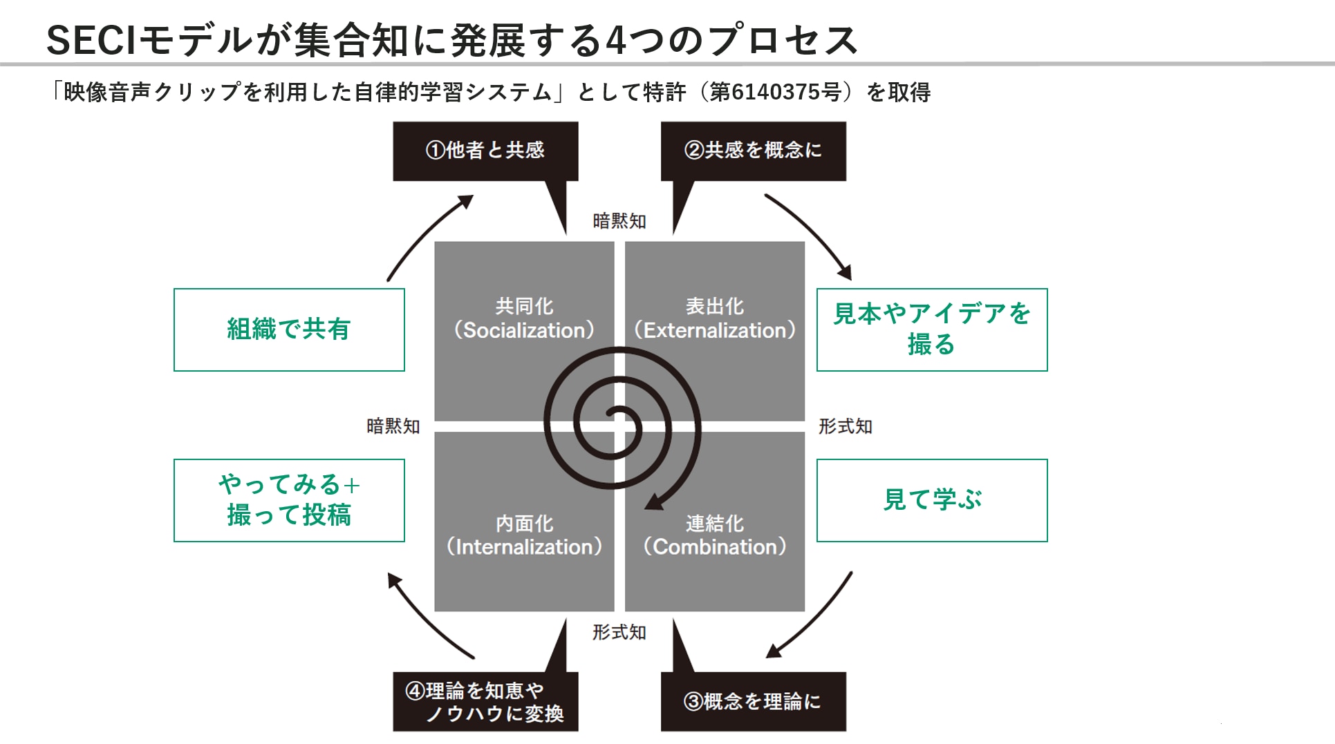 こうした課題をもつサービス業において、暗黙知をどうやって形式知化し、組織改善、企業改善につなげるのか。野中郁次郎氏のSECIモデル(共同化・表出化・連結化・内面化)のサイクルを映像を介して回すことで実現する弊社のシステム「ABILI Clip」についてご紹介しました。