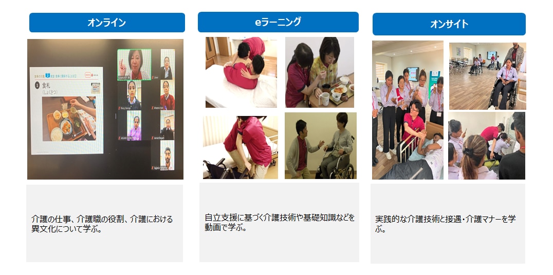 特定技能制度を活用し「日本で介護士として長く活躍できる人材」を育成することを目的に、デジタルツールと対面研修を融合させた独自の教育プログラムを構築しました。