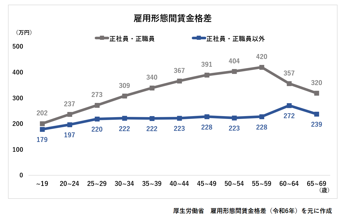 社会問題としても大きく取り上げられることが多いのが、正社員との賃金格差です。上記のグラフは業種を問わず雇用形態による賃金格差を表したものですが、正社員は59歳まで昇給傾向があるのに対し、正社員以外では年代による変化がほぼなく、長期継続による昇給もほとんどないと考えられます。また、正社員にはOJTに加えOFF-JTなどの能力開発やスキルアップ機会がありますが、正社員以外に同等の機会が与えられることはほとんどありません。厚生労働省の報告書によると、平成23 年度能力開発基本調査で、OFF-JT及び計画的なOJTの実施状況は正社員ではそれぞれ71.4%、63.0%であるのに対し、正社員以外ではそれぞれ32.9%、30.8%と低い水準であることが明らかになっています。
