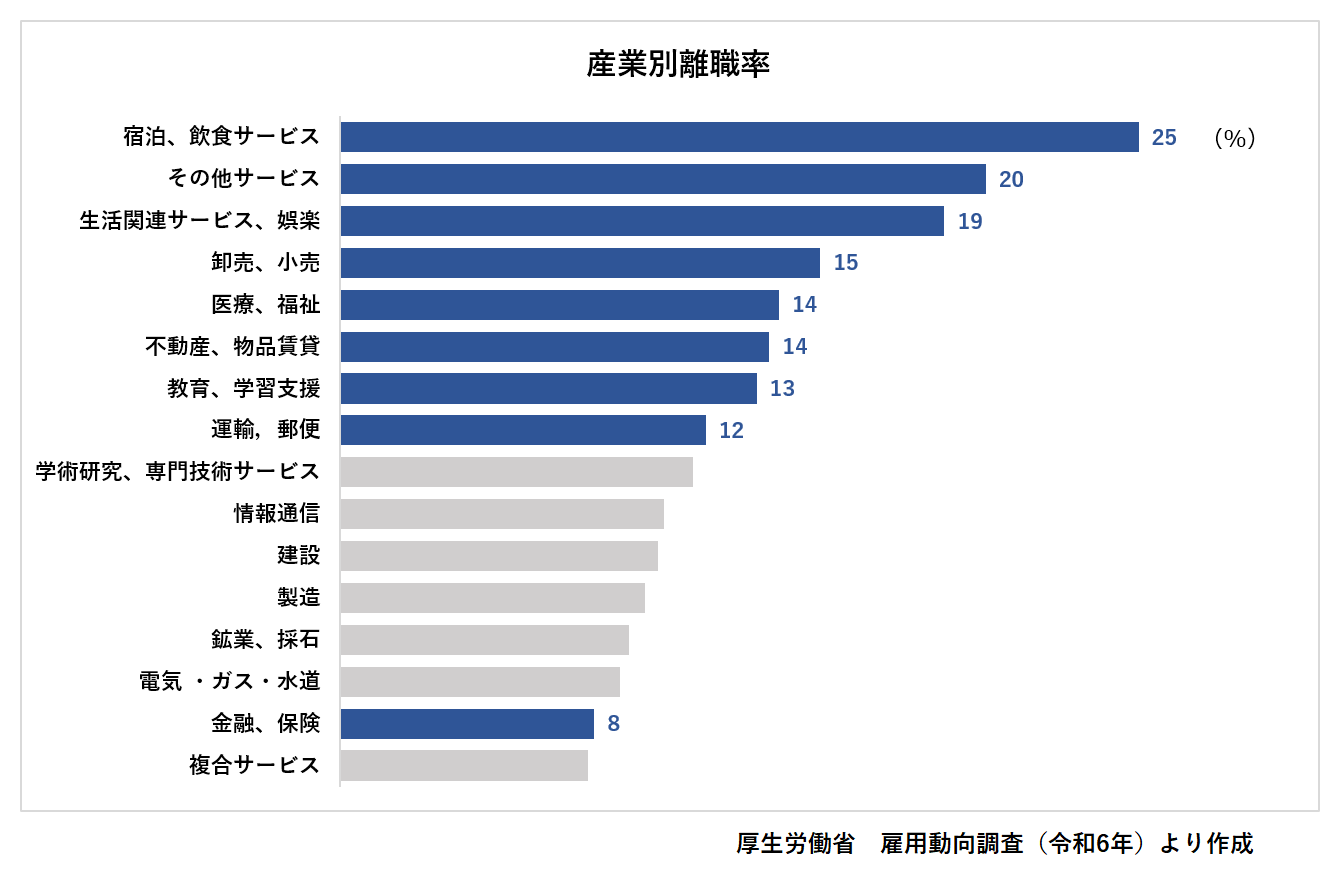賃金状況と相関するように、離職率が高い傾向がみられます。上記は正規・非正規の区別がない調査結果ですが、非正規に限定するとさらに高い数値になると予想されます。慢性的な人手不足の背景には、低い賃金で入社・入職し、定期的な昇給やスキルアップの機会がないため、長期就労によるメリットやキャリアパス形成が難しい状況になり離職に至るというひとつのサイクルができあがっていると考えられます。